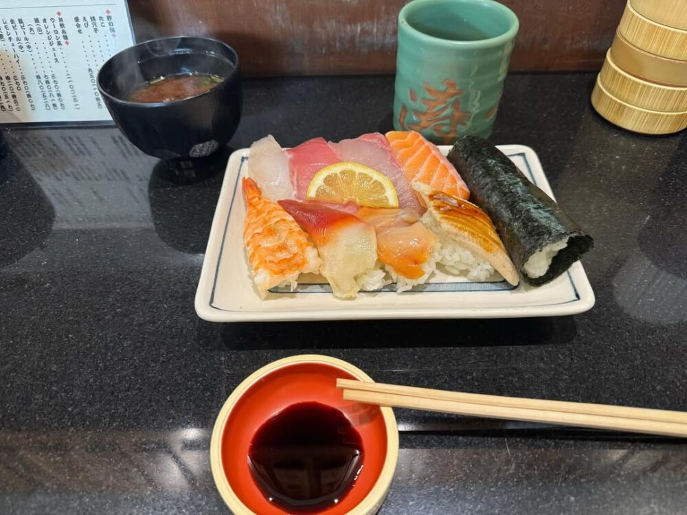 ランチタイムは、にぎり盛り合わせと赤だしのセットを「500円(税抜)」で食べられるのが魅力。まぐろやはまちなど6貫ほど入っています。