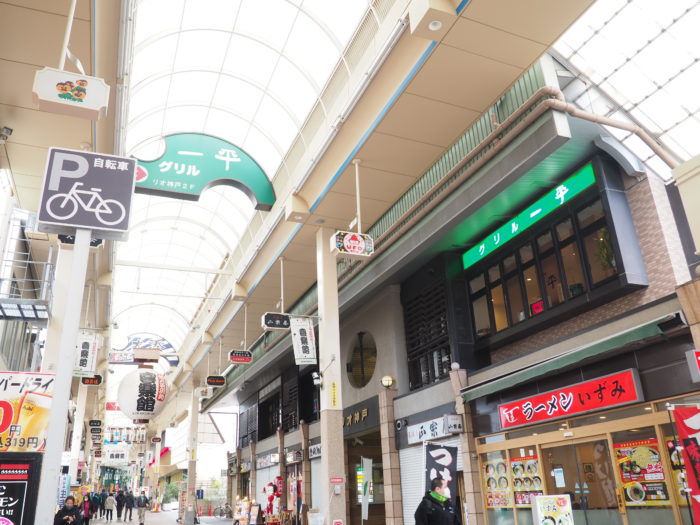 『グリル一平 新開地本店』は、高速神戸線 新開地駅から徒歩約1分、新開地商店街の中にあります。