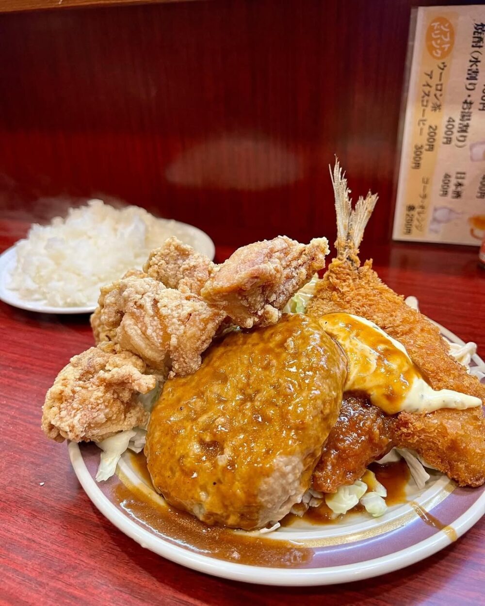 「デカ盛りグルメ」で人気のお店で、迫力満点のボリューミーな定食を食べることができます。行列のことも多いみたいですよ。