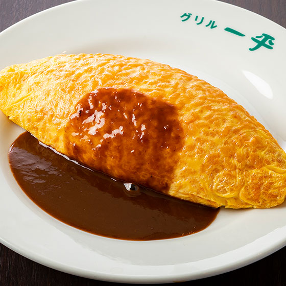 グリル一平の代表メニューは、薄焼き卵の「オムライス」。トマト缶を使ったレッドソースと、デミグラスソースをバランスよく混ぜ合わせたオリジナルのソースがかかっています。