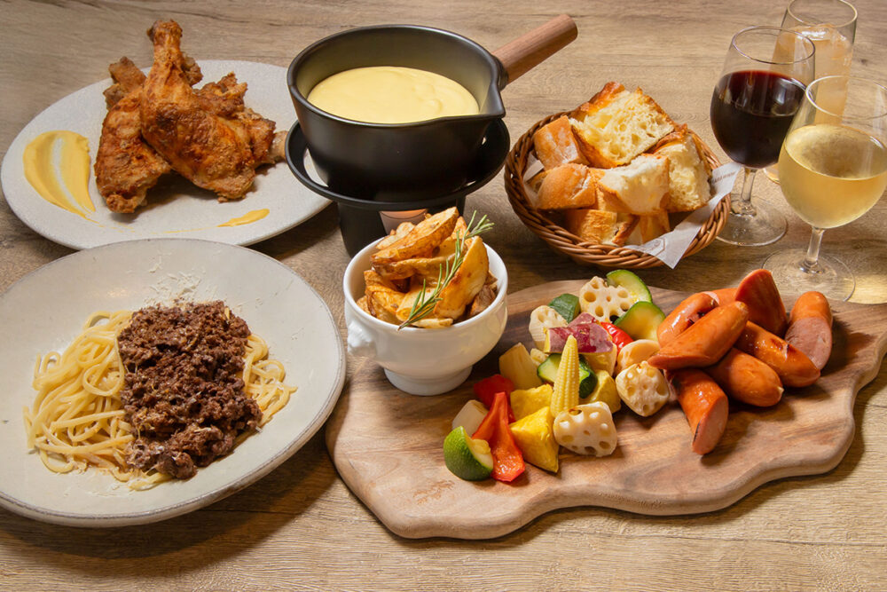 ボロネーゼ・ローストチキン・ポテトなど、どのメニューもチーズをディップしながら楽しめそう。
