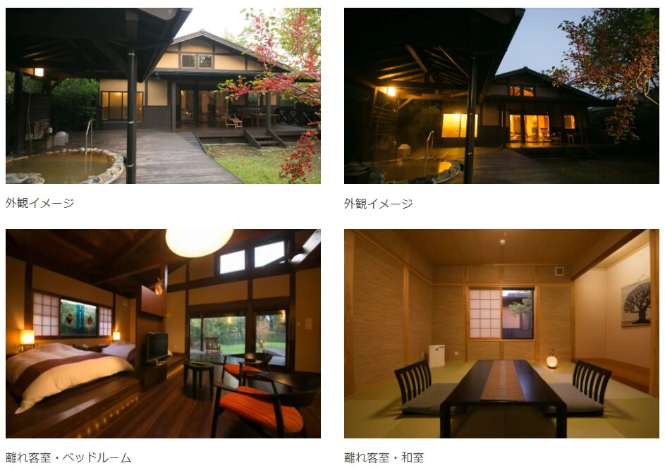 2つ目は「フリューゲル久住」の離れ客室。約1万2千坪の敷地に立つ、全棟離れ&スイートルームの癒しリゾートです。