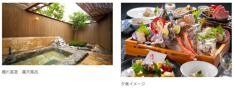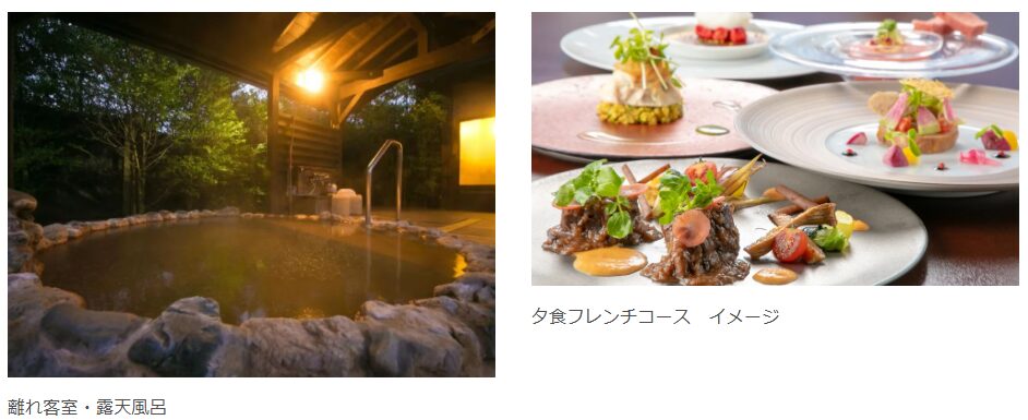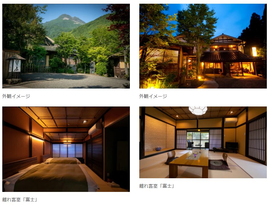 1つ目は「由布院温泉ほていや」の離れ客室「富士」。由布岳のふもとにある村のような宿で、 一棟貸しの内風呂、露天風呂付きの離れ客室で休日を贅沢に過ごすことができるんだそう。