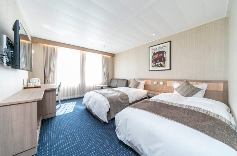 フェリー船室は、客室は20.8平米とホテル並みの広さがあり、高級感のある部屋になっています。全船スイート個室は、バストイレ付き。