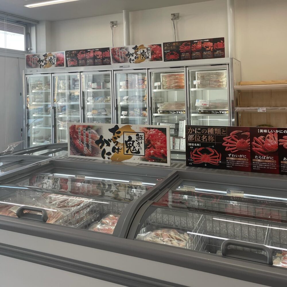 店内はスーパーのような雰囲気で、買い物かごを持って買い回るシステム。ズワイガニ・タラバガニを中心に、カニだけでなく、ほたて・あわび・牡蠣・海老といった海産物も販売されています。