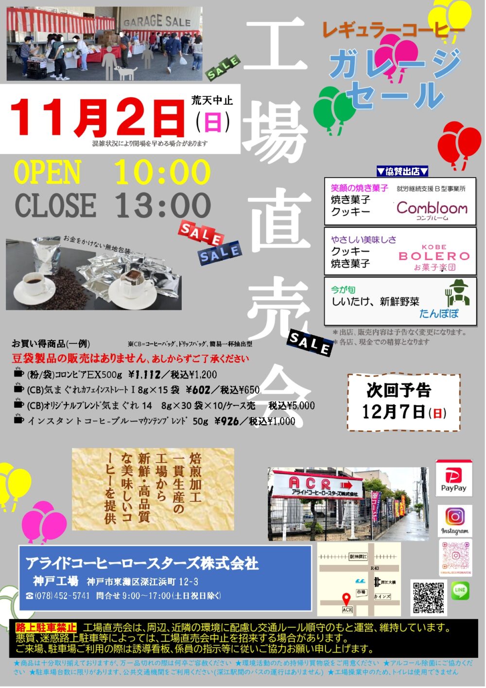 ガレージセールは10:00~13:00までの3時間限定で開催され、11月には500グラム1,200円の「コロンビアEX(粉)」や、お得なドリップバッグ、インスタントコーヒーなどが販売されています。