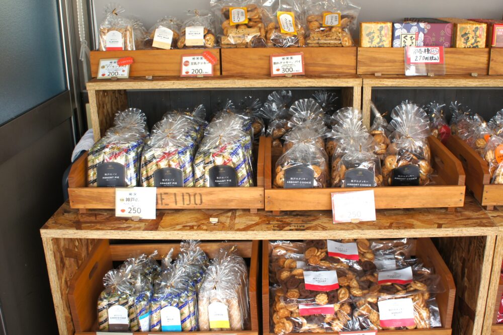 他の店舗では販売されていない「直売店限定商品」や、賞味期限の近い「大特価商品」のほか、神戸のスーパーでは買えないような「地方のお菓子メーカー」の商品も販売されています。