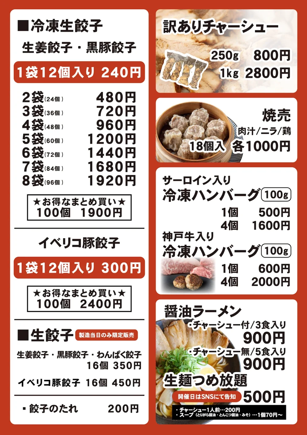 定番の「冷凍生餃子」は、一人暮らしでも買いやすい「12個入(240円)」から、お得にまとめ買いできる「100個入(1,920円)まで、いろんな個数で用意されています。製造当日のみ限定販売される「生餃子」は、16個(350円)から。