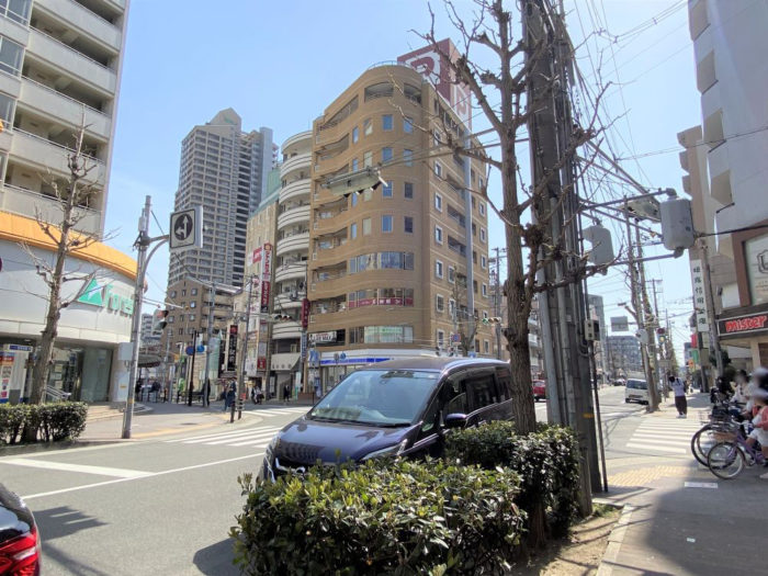 西を向くと、こんな感じ。同じ並びに「ローソン 六甲道北店」が、向かいに「ミスタードーナツ」があるところです。