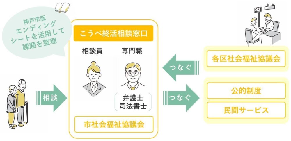 『こうべ終活相談窓口』は遺言や葬儀など終活に関する相談を市が無料で受け付け、弁護士や司法書士による専門相談も提供する取り組み。
