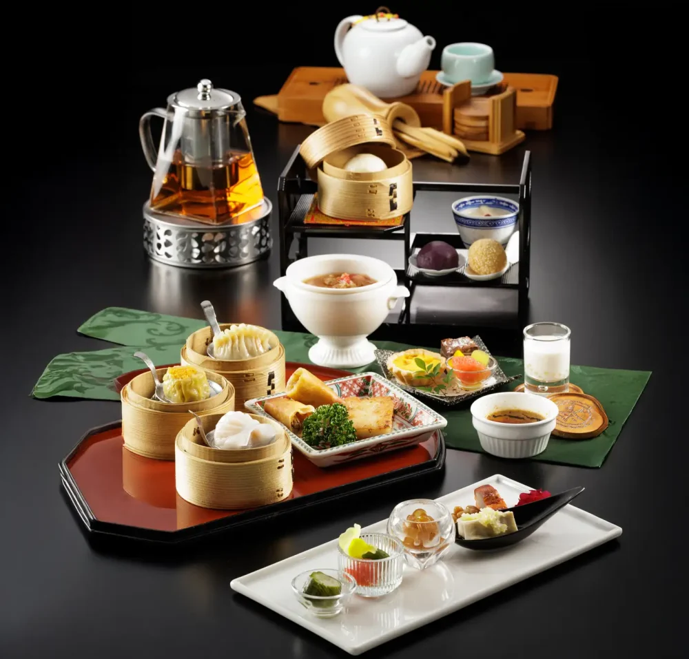 中国ランチ『桃華』は平日13:00以降で提供する限定メニューとなり、フカヒレスープや蒸し・揚げ・焼の点心5種に続き、中国茶を中心とした香り豊かなお茶や、中国菓子を含む全8種のスイーツがセットに。