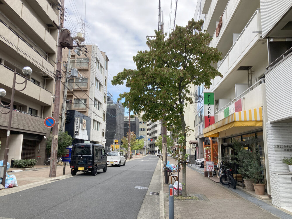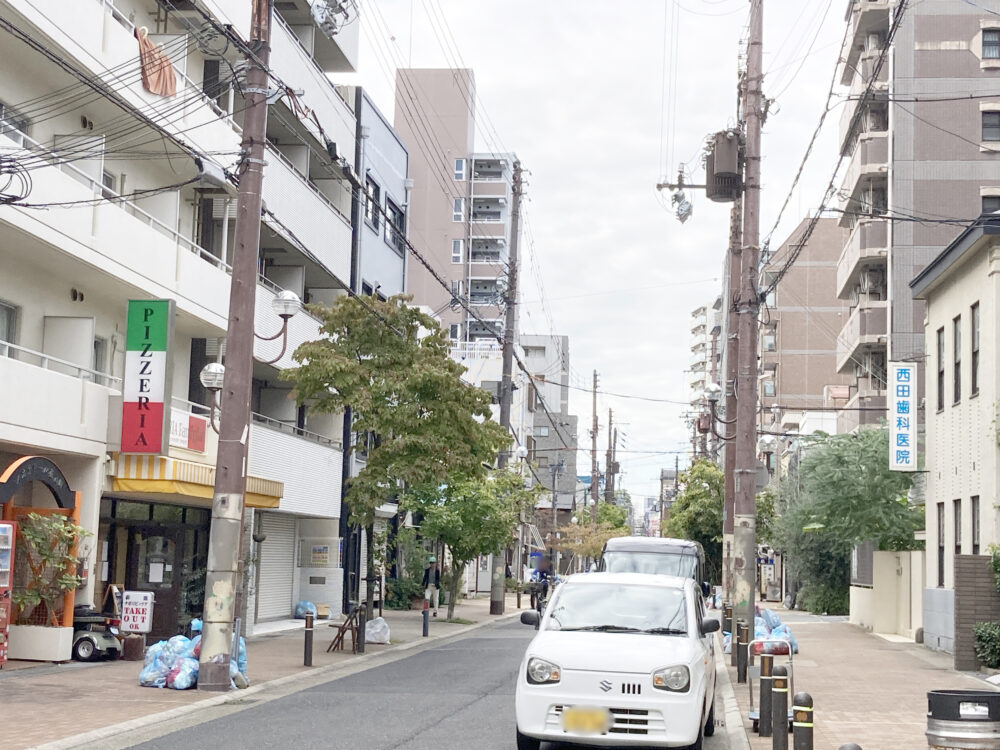 向かいには「西田歯科医院」があって、西へ進むと行列ができる「洋食の朝日」や商店街「メルカロード宇治川」がある方向。