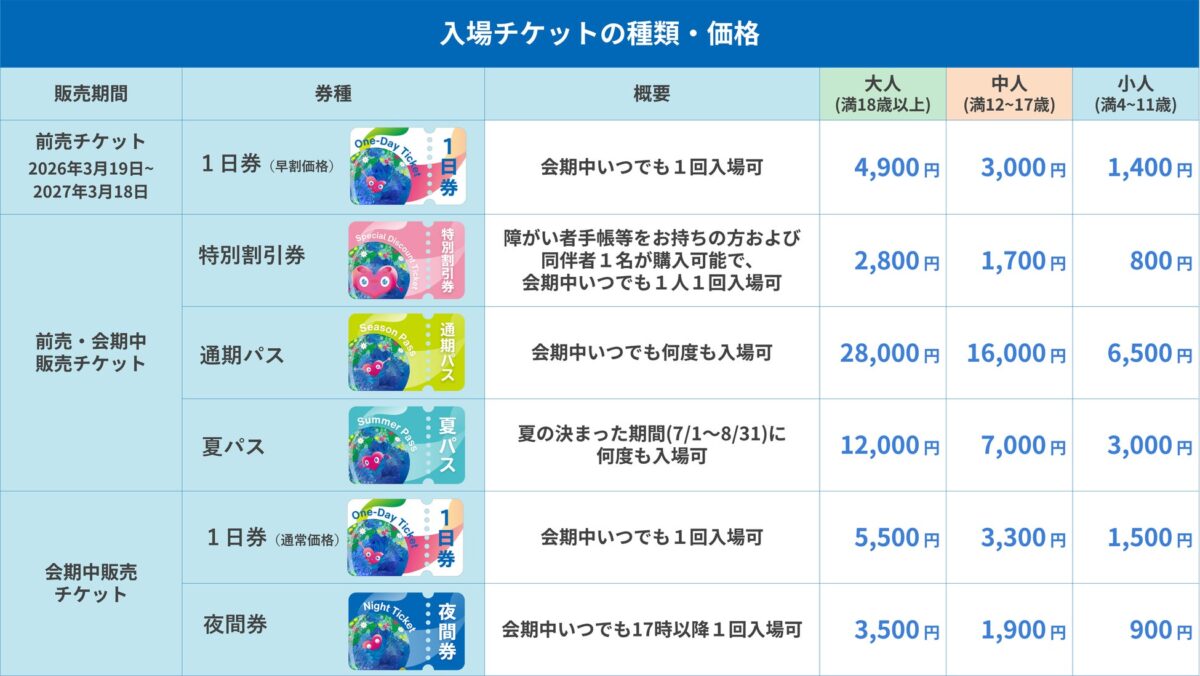 「1日券」は「GREEN×EXPO 2027」開催前日の2027年3月18日(木)までの販売となっていて、大人(満18歳以上)は600円、中人(満12〜17歳)は300円、小人(満4〜11歳)は100円安く購入することができます。