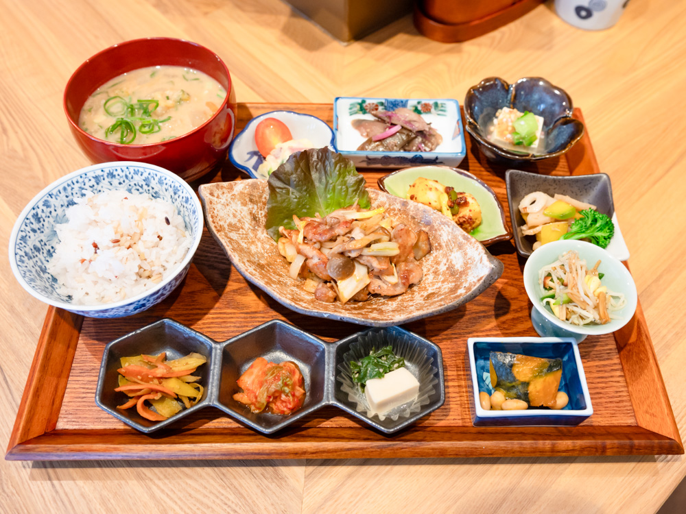 じゃーん!こちらがお店のイチ押しのランチセット「一汁千菜ご膳(1,600円)」です。ご飯とお味噌汁に、おかずは主菜を中心に、野菜をたっぷり使った副菜がたくさん並んでいて、1食で約30品目とれるんですって。