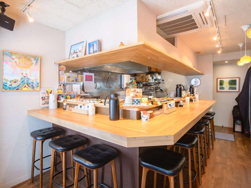 店内はこんな感じで、カウンター・9席の小さなお店です。オーナーのご縁で集まった絵や小物作品があちこちにディスプレイされていて、楽しい雰囲気。