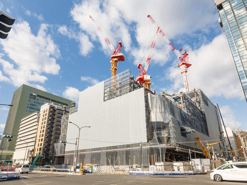 現場では2階デッキや歩道橋から工事の様子をじっくり眺めることができ、観光客や街行く人が、足を止めて見入る様子が見られましたよ。どんなランドマークになるのか楽しみですが、まだまだ変化が著しい再整備エリアでは、通行止め箇所や動線など、お気をつけてお出かけくださいね。
