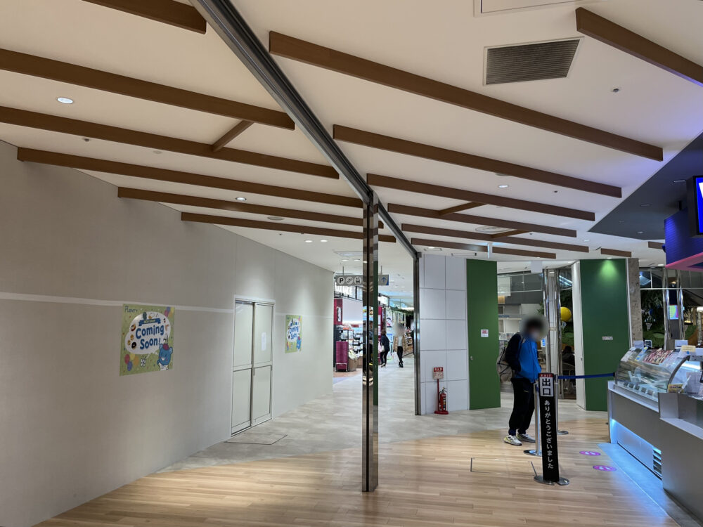 お店のエリアは今は白い壁に囲われ、お店から閉店を知らせるための貼り紙と、プレンティのキャラクターが描かれた「NEW SHOP Coming Soon!」のポスターが貼られてます。