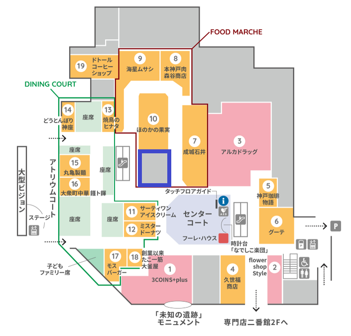 時計台のある広場「センターコート」とフードコートの間にあるエリアですね。