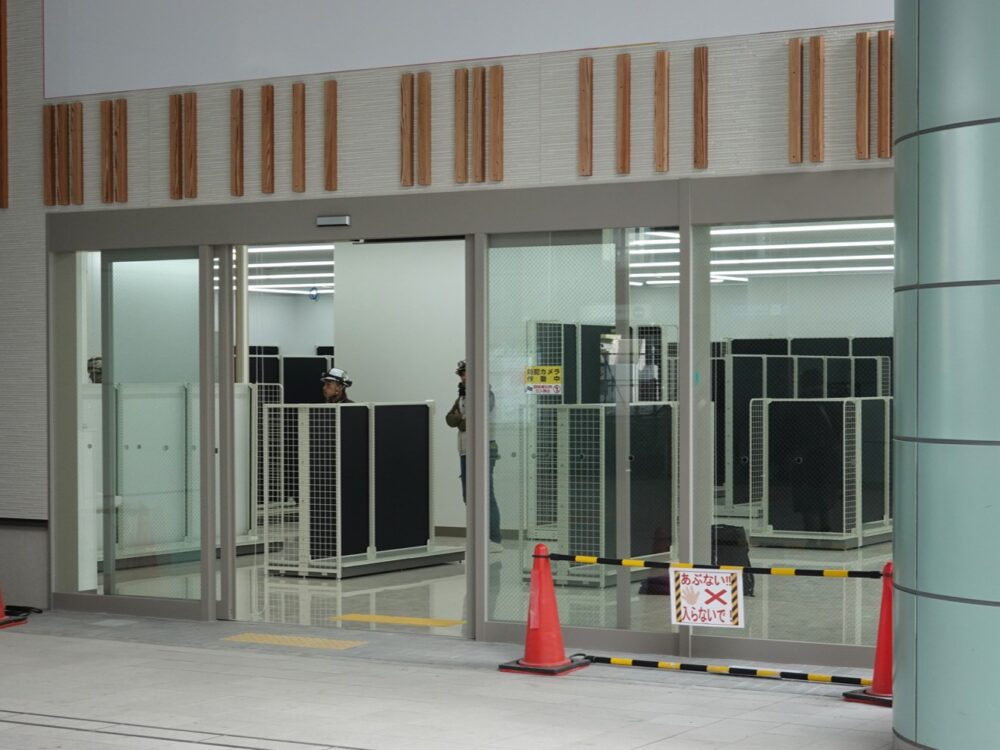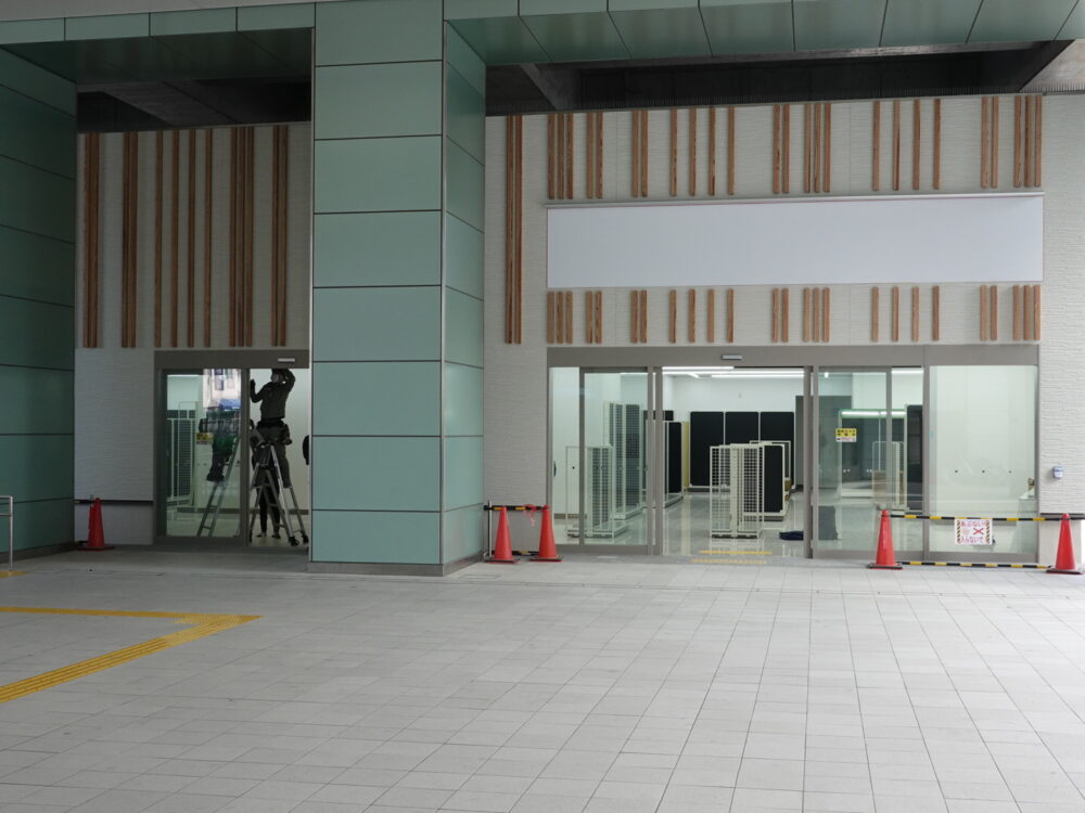 改装工事が進められていて、正面には「自動ドア」が設置されています。中を見ると棚らしきものがずらっと並んでいますね。