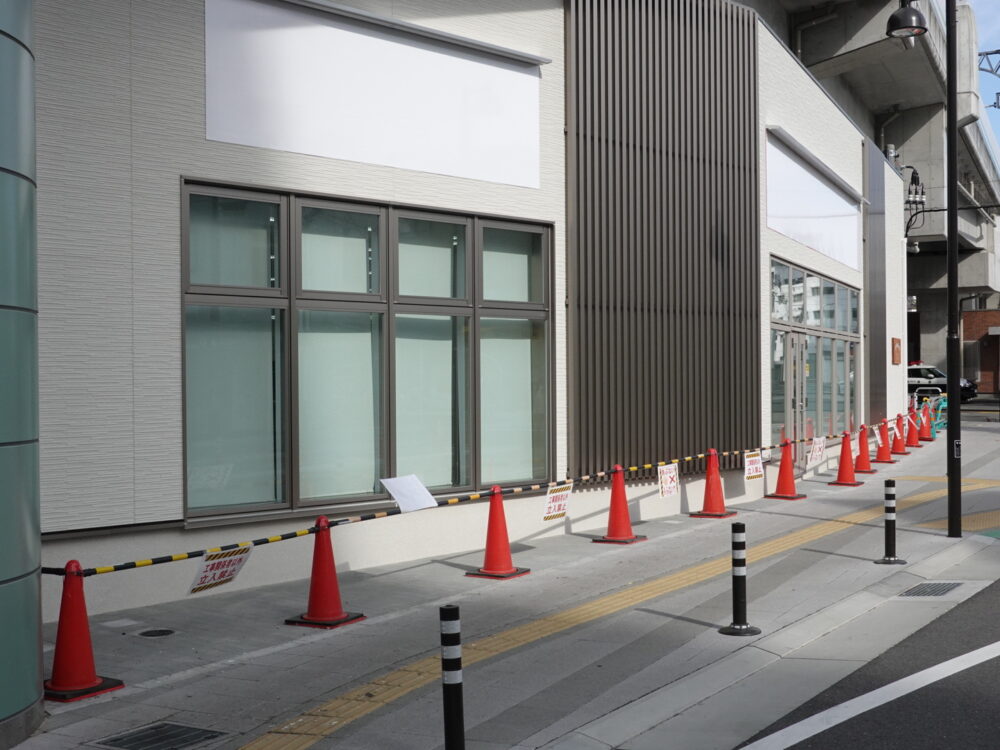 外側から見るとこんな感じ。大きな窓が取り付けられ、赤いコーンが置かれています。結構奥行きがありそうで、店内も広いんじゃないでしょうか。
