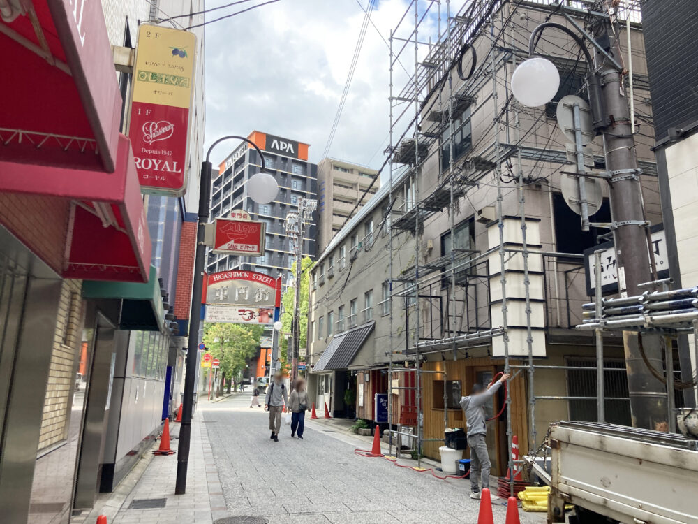 東を向くと東門街のメインストリートと接続する三叉路。角に「パティスリーROYAL」があります。