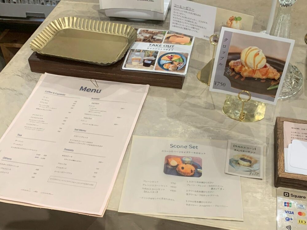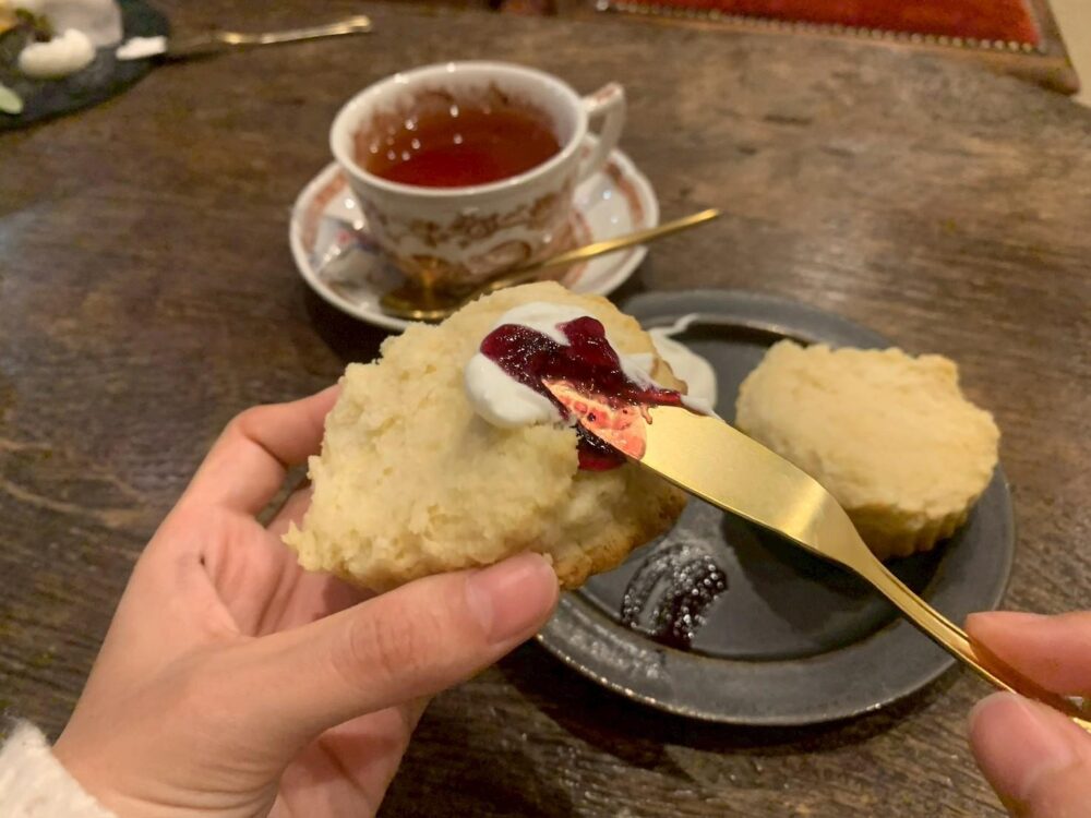 今回は「プレーンスコーン(500円)」と「ルイボスキャラメルティー(650円)」を注文。トッピングのクリームはクロテッドクリームまたは生クリーム、ジャムはラズベリー・ストロベリー・ブルーベリーの3種から選べます。