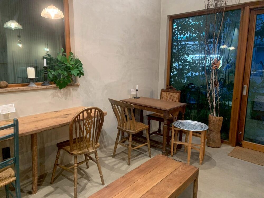 店内はカウンター席が5席、テーブル席が14席。お店はガラス張りになっていますが、入口付近に植えられた木々によって外からの視線や様子は気になりません。