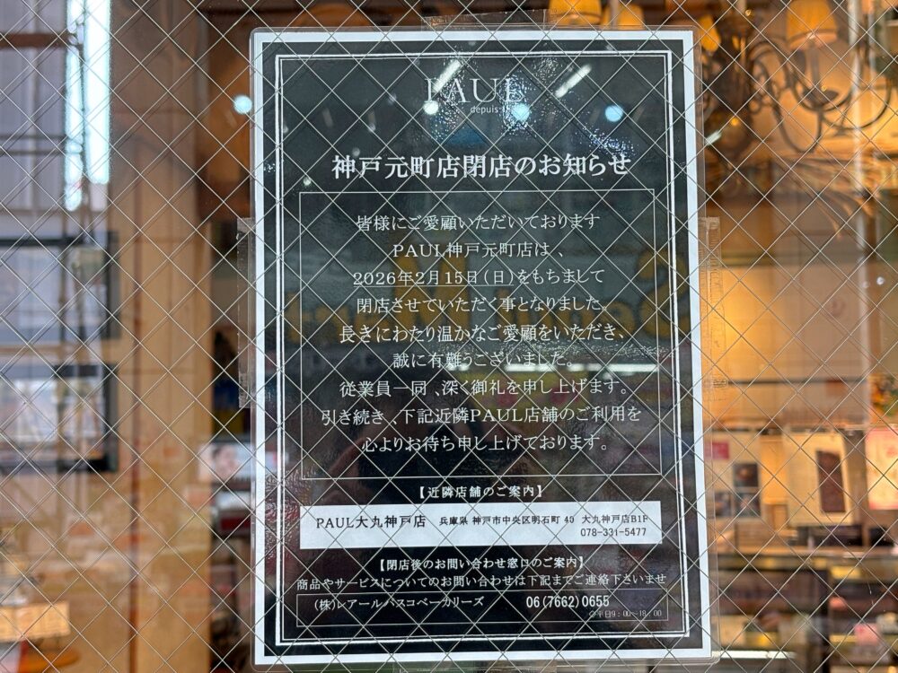 元町商店街にあるベーカリー『PAUL 神戸元町店』が閉店するそうです。