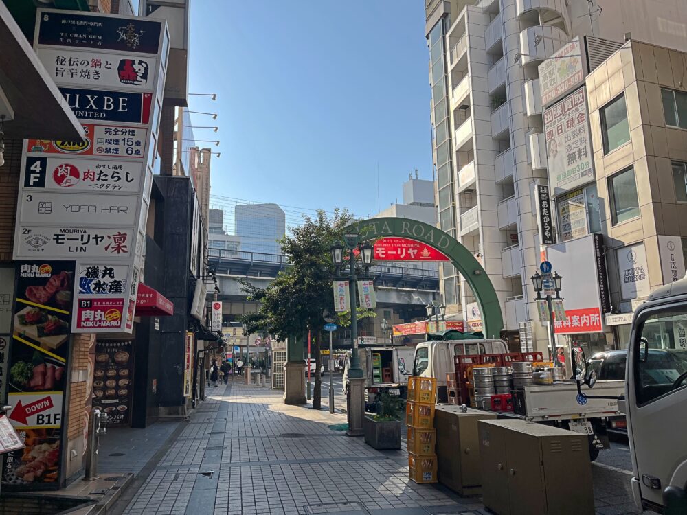南側を向くとこのような感じ。いくたロードの東側に位置していて、向かい側にはカラオケ「ビッグエコー」や「かに道楽」、「しゃぶ葉」が入っている「キングスコーストビル」があります。