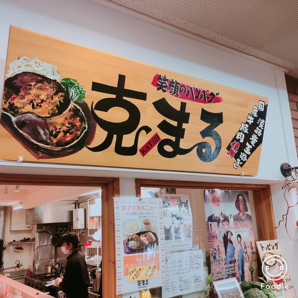 『克まる』は、さんプラザ地下の北側の道沿いにある、ハンバーグ専門店です。お昼時には行列ができることも多いみたい。