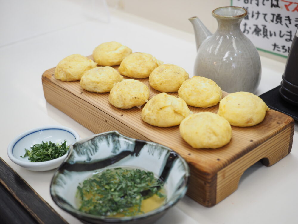 卵たっぷりふわふわ生地とコリコリしたタコの食感が楽しめるたこ焼きを、お出汁につけていただきます。ソースもあって味変することも可能です。